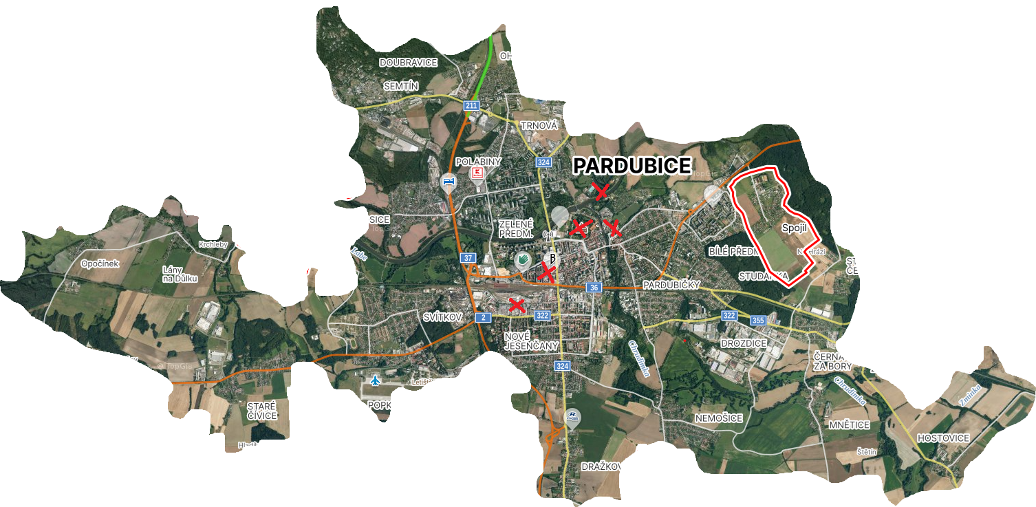 Najdi na mapě: 1. Pardubický zámek 2. Zelená brána 3. Pernštýnské náměstí 4. Automatické mlýny 5. Park na Špici